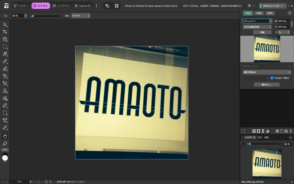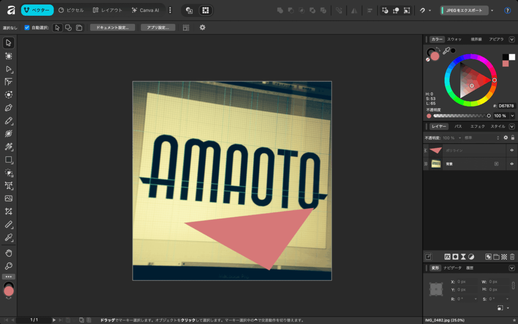 最後にAffinityの最大と特徴の一つが、トリミング完了後に他のアプリケーションを起動する必要がなく、左上部メニューをベクターに切り替えるだけで、イラストレーター的な機能を追加することが可能。