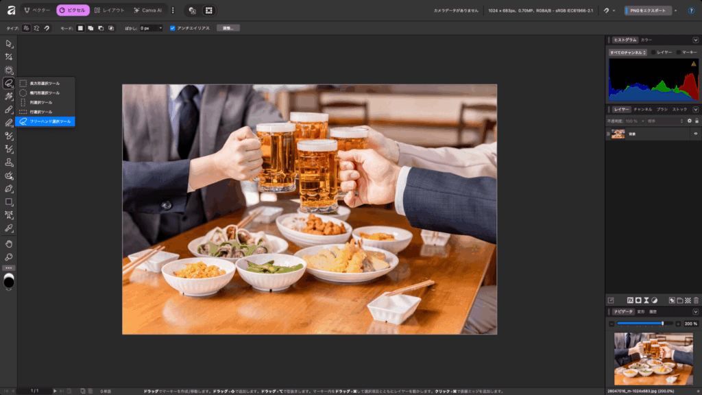 画像を読み込んだら、左メニューの「フリーハンド選択ツール」を選びます。