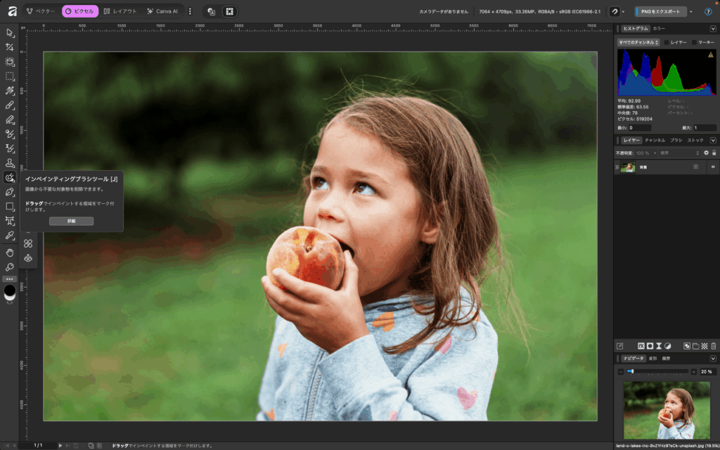 まずは普通に画像を読みこんだ後、左メニューからインペインティングブラシツールを選択します。