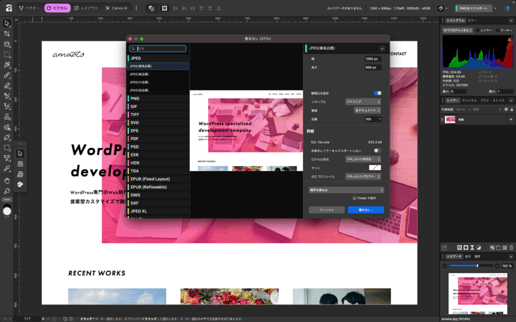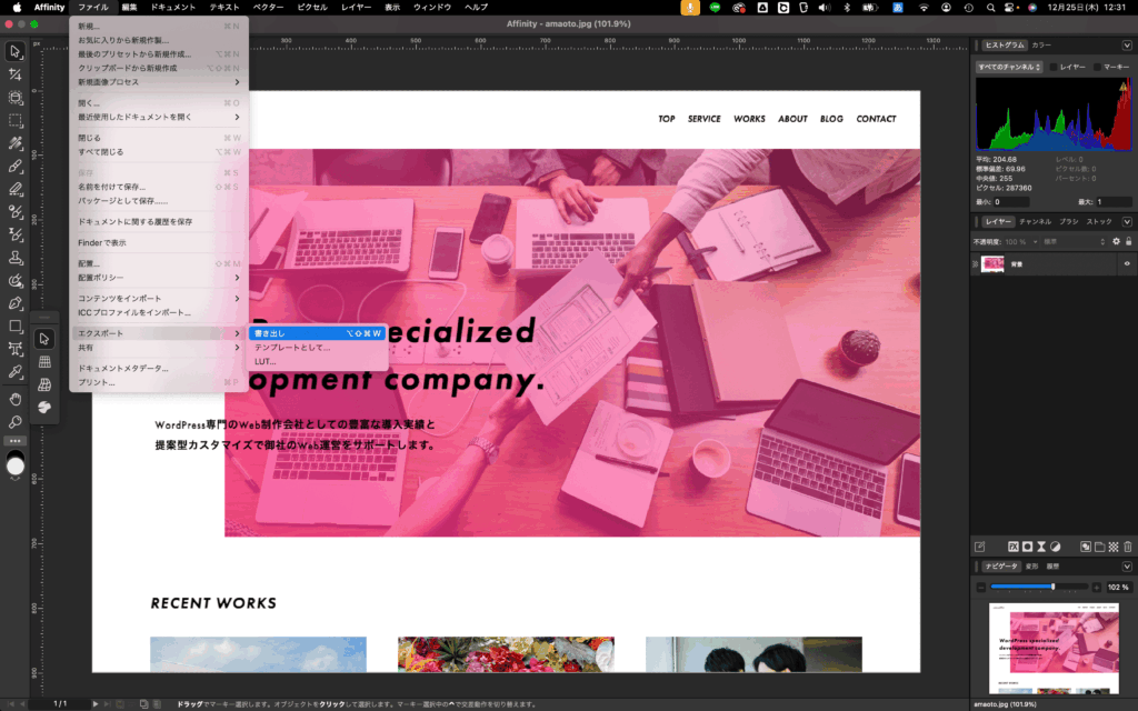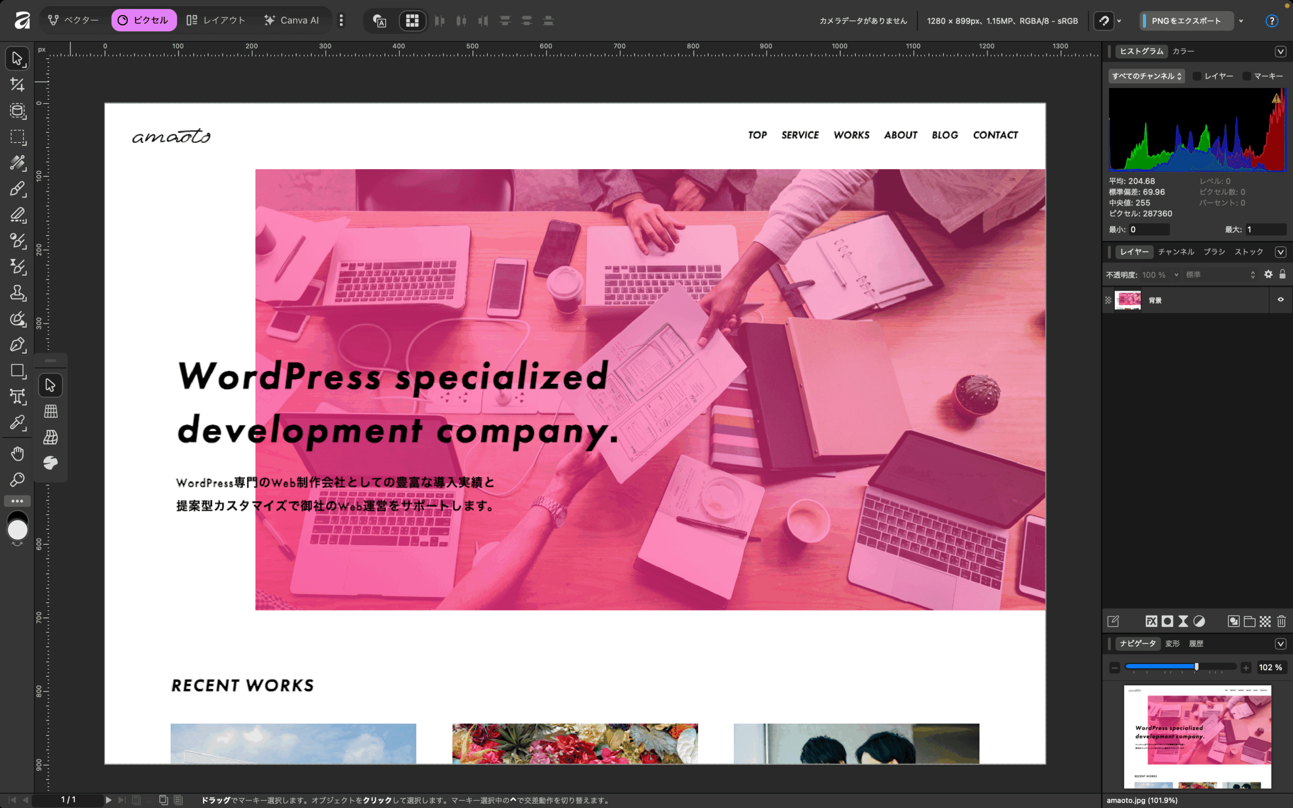 まずはリサイズしたい画像をAffinityに読み込みます。今回は弊社のコーポレートサイトのスクリーンショットを読み込んでいます。サイズは、横1280px・縦899pxとなります。