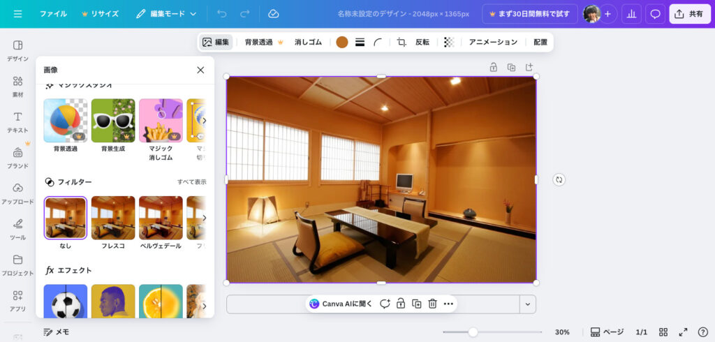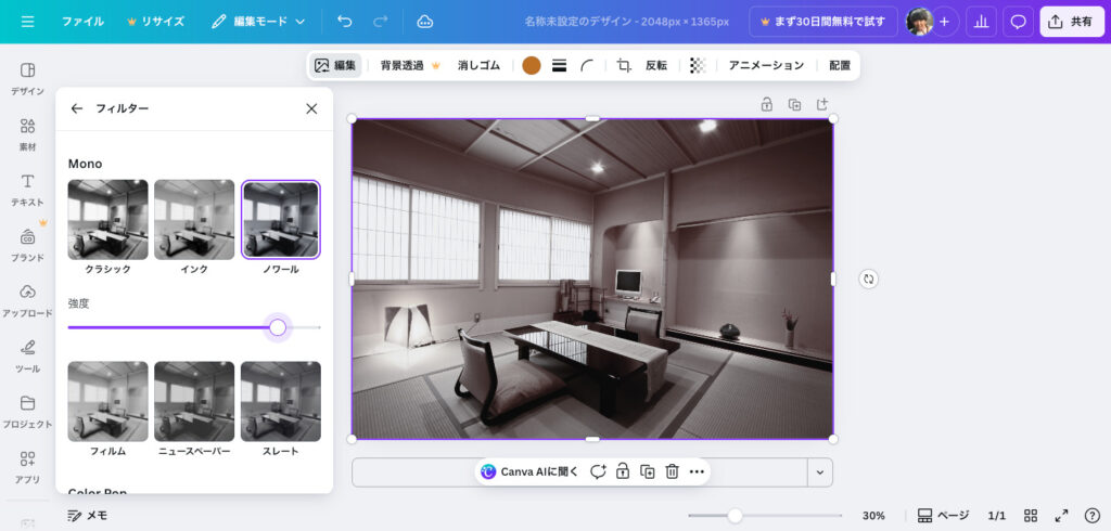 さて、Canvaには様々な画像加工機能がありますが、今回は画像をモノクロ調に変更する方法を書きたいと思います。