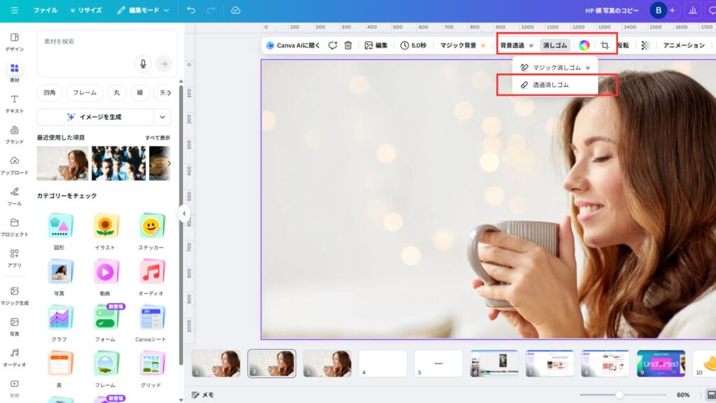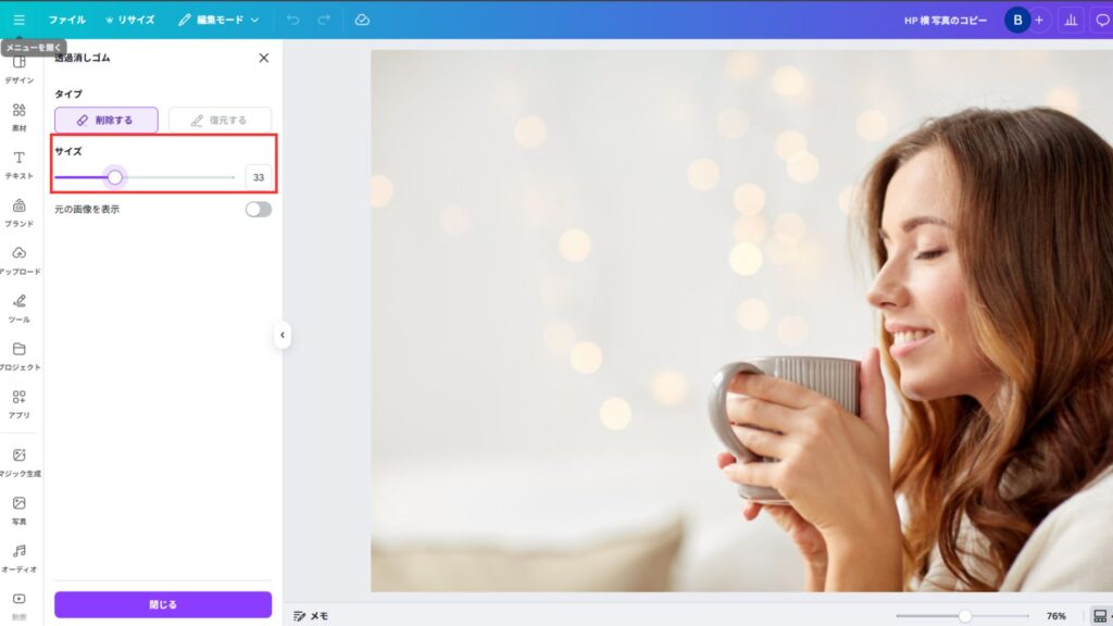 Canvaの編集画面で写真を選択し、「消しゴム」ツールを開くと、