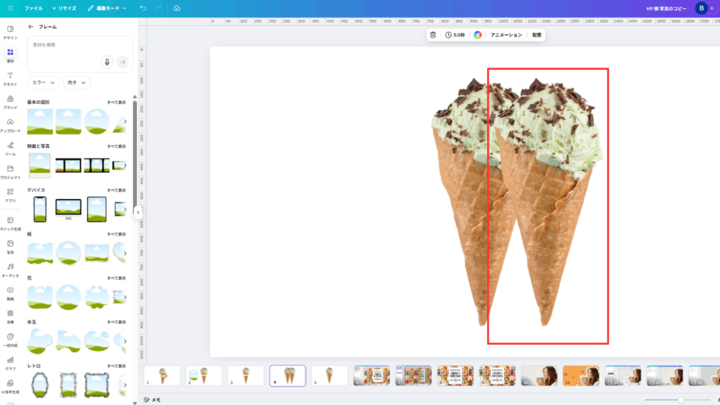 Canvaだけでも、食品写真を“半分にカットして動きをつける”表現が簡単にできます。