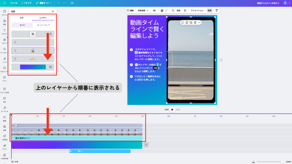 今回の Canva動画アップデート 2.0 では、ついに 動画レイヤー機能が強化され、重なりが可視化されたことで、これまでよりずっと直感的に編集できるようになりました。