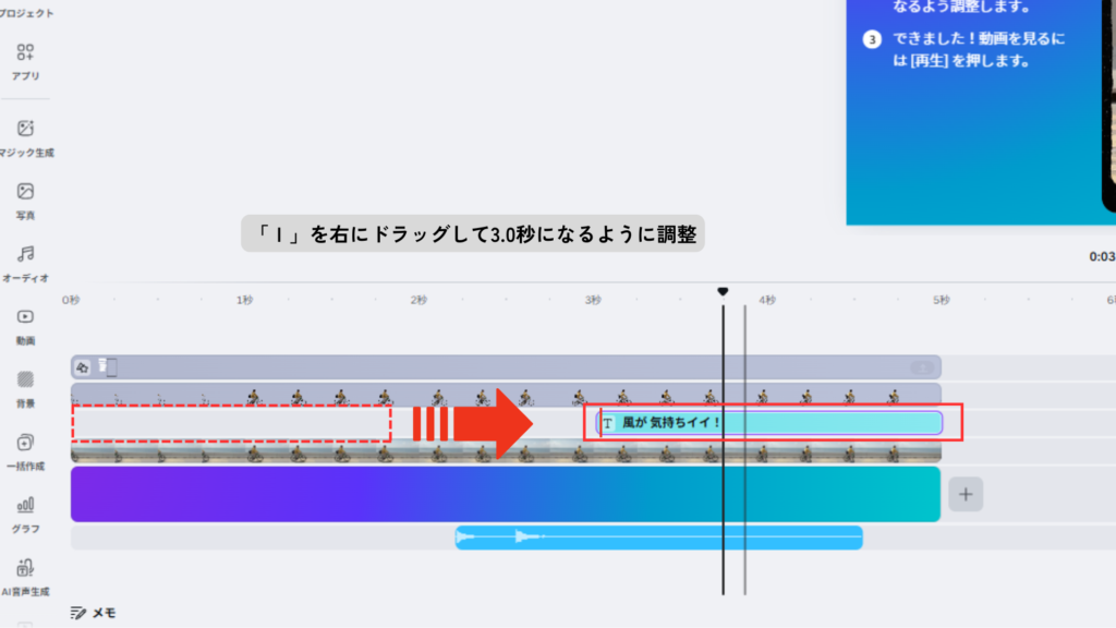 テキストのレイヤーの「l」を右にドラッグして 開始時間を 0秒 → 3秒 に変更