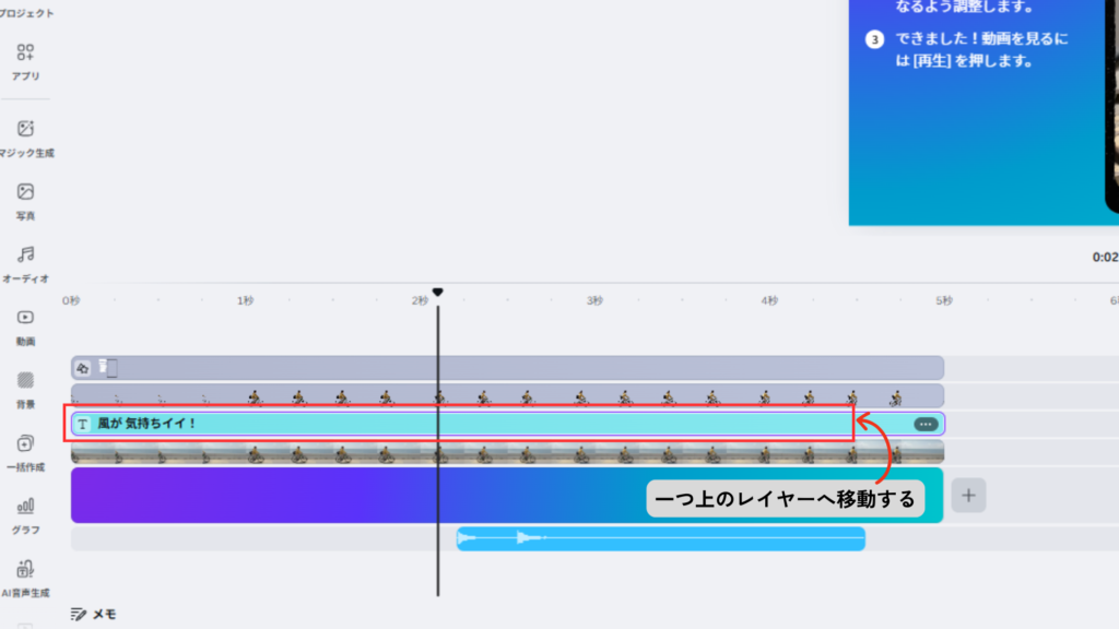 2. テキスト「風が気持ちイイ!」のレイヤーをテキストをドラッグして一つ上のレイヤーに上げる