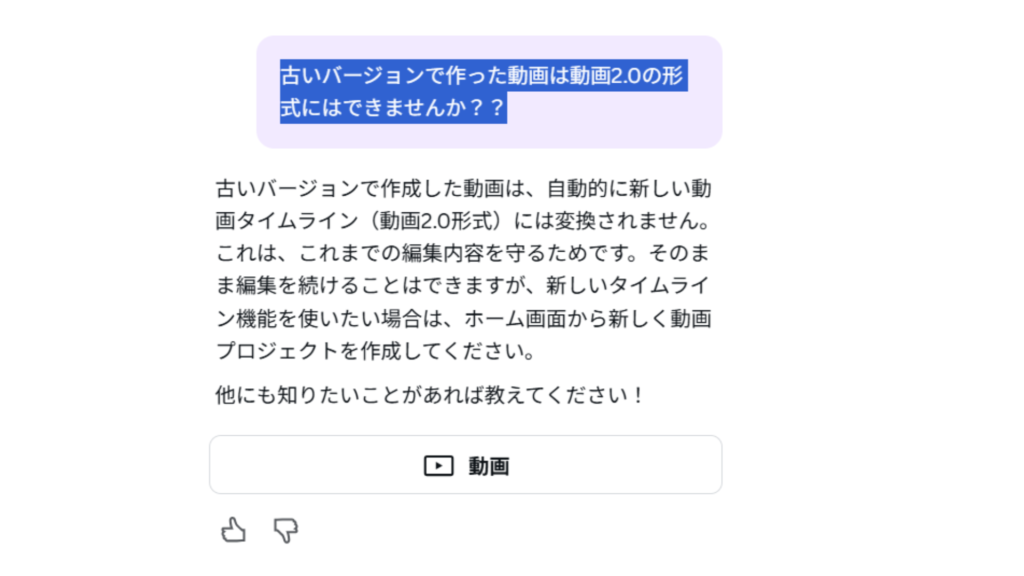 古いバージョンの動画は、自動的に「動画 2.0(新タイムライン形式)」に変換されません。