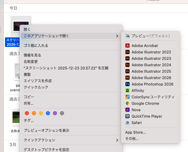 保存されたスクリーンショットを右クリックして「このアプリケーションで開く」からプレビューを選択します。