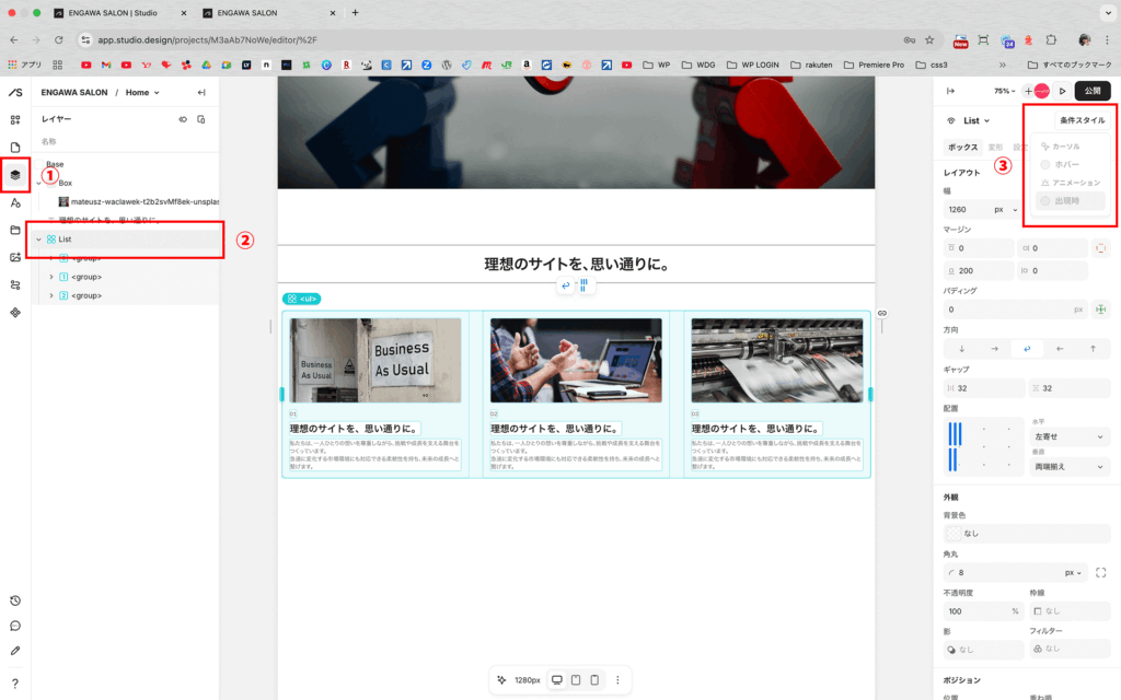 今回は、②のListをクリックします。するとコンテンツ側の背景が薄い緑になり、指定していることが確認できます。